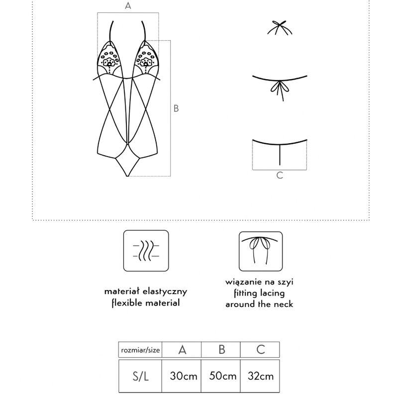Um body minúsculo e sensual vai acender sua imaginação e transformar a noite em uma experiência inesquecível. O body Luisina consiste em um sutiã de renda delicado e uma tanga com um charmoso motivo de rosas. A tanga e o sutiã são conectados com um emaranhado de tiras que enfatizam a cintura e as curvas femininas. Um sutiã que revela parcialmente os seios enquanto os levanta levemente adiciona um toque incrível a todo o visual. As tiras habilmente dispostas que fluem entre os seios até a tanga estilizam opticamente a figura. Os quadris e ombros praticamente expostos, assim como a tanga, são adornados com um bralette de renda. Assim como as costas e as nádegas, que são decoradas apenas com uma tira de tanga e duas tiras, tornam-no uma proposta ousada para ela.